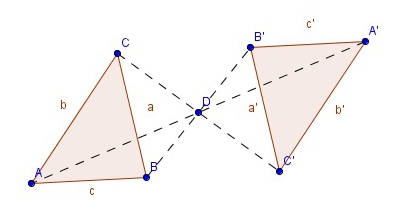 Das Dreieck ΔABC ist kongruent dem Dreieck ΔA'B'C', da es mit der Kongruentbewegung „Punktspiegelung“ überführt werden kann.